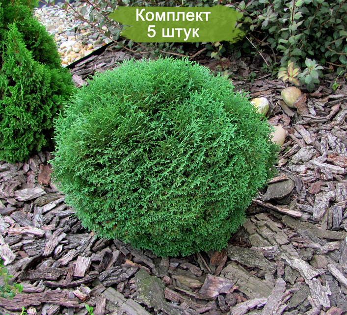 Комплект саженцев карликовой туи сорта "Тини Тим" (Tiny Tim) включает 5 штук по цене 4. Это экономичное предложение для любителей садоводства.