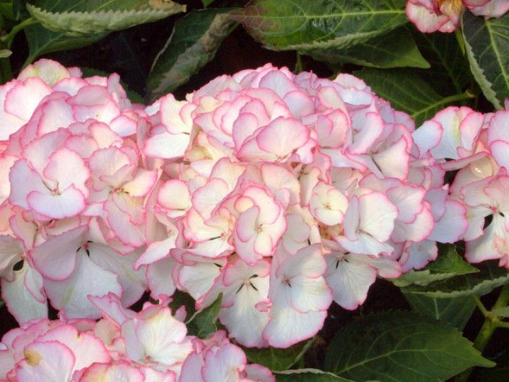 Гортензия крупнолистная Клеопатра (Cleopatra) представляет собой великолепный декоративный кустарник с прямостоячими стеблями. Листья у этого растения простые, яйцевидной формы, насыщенного зеленого цвета. Цветки крупные, шаровидные, достигают 20-25 см в диаметре и формируются на концах побегов. Период цветения приходится на июль-август. Интересной особенностью этого сорта является возможность изменения окраски цветков в зависимости от кислотности почвы.
